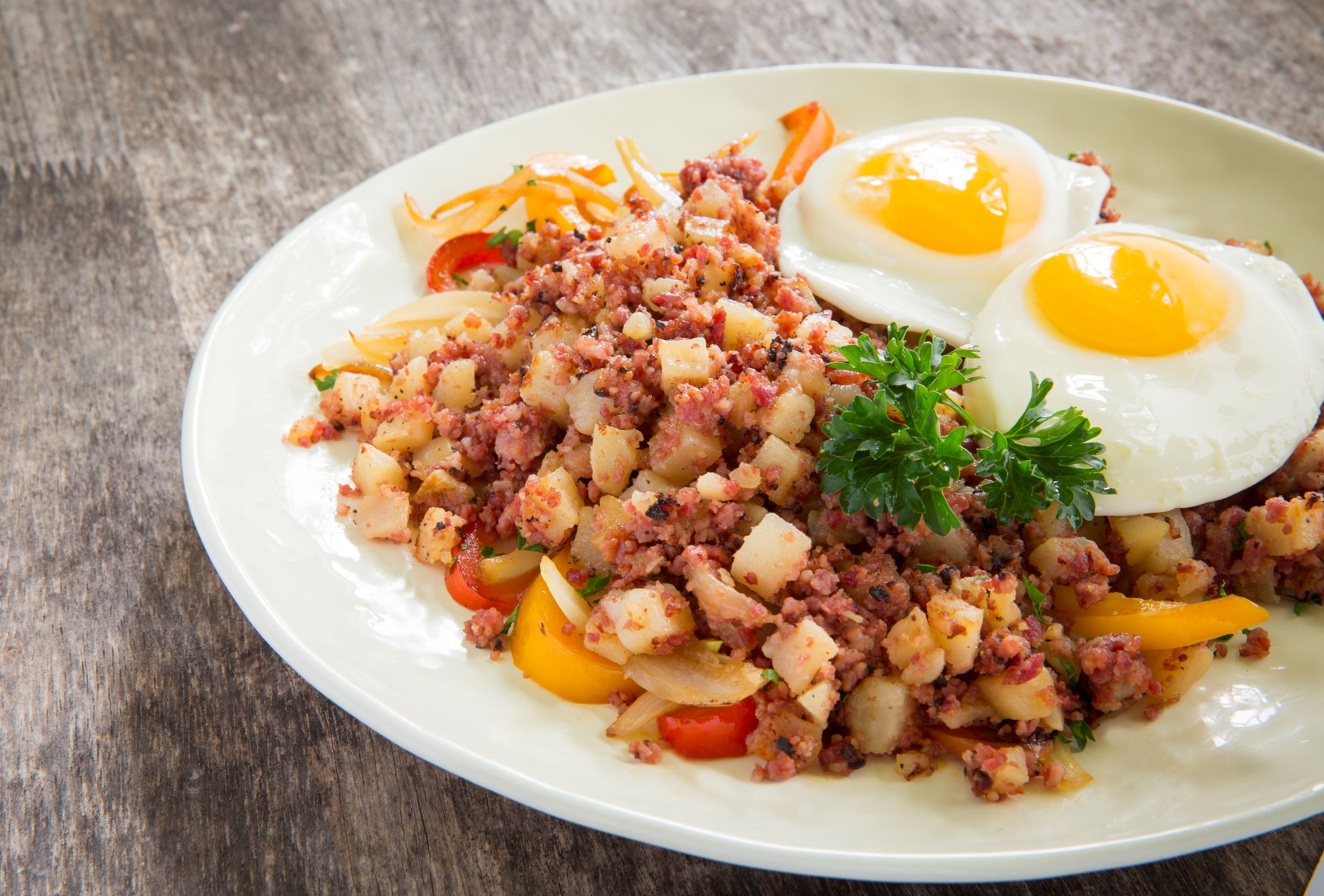 Finely chop sliced corned beef. Lightly brown diced potatoes in skillet with a small amount of vegetable oil.